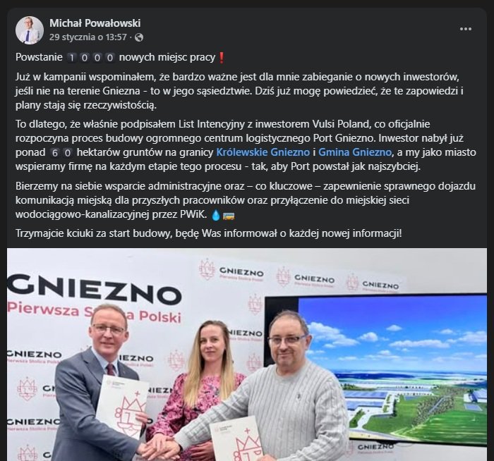 29 stycznia, czyli dzień po głośnym głosowaniu w Radzie Miasta Gniezna za podwyżką cen śmieci, Michał Powałowski, Prezydent Gniezna opublikował wpis w swoich mediach społecznościowych z nagłówkiem: „Powstanie 1000 nowych miejsc pracy!”. Do postu dołączono zdjęcia z podpisania listu intencyjnego z inwestorem – Vulsi Poland, co ma być oficjalnym rozpoczęciem inwestycji na działce o wielkości 60 hektarów w Gminie Gniezno. „Bierzemy na siebie wsparcie administracyjne oraz – co kluczowe – zapewnienie sprawnego dojazdu komunikacją miejską dla przyszłych pracowników oraz przyłączenie do miejskiej sieci wodociągowo-kanalizacyjnej przez PWiK” – przekazał prezydent. Jednak na ceremonialne podpisanie dokumentu nie zaproszono dziennikarzy, co jest stałą praktyką w podobnych wydarzeniach. Ziemia Gnieźnieńska, opozycyjny klub w samorządzie zauważa, że wpis włodarza miasta wprowadza w błąd media i mieszkańców. – Wpis jest powszechnie przyjmowany przez media i ludność, jako informacja pewna. Jakoby miasto sukcesem zakończyło proces starania się o inwestora, który zapewni w przyszłości miejsca pracy dla gnieźnian – powiedział na konferencji prasowej Robert Gaweł, miejski radny. Zauważa tutaj, że post poniósł się daleko, bo powieliły go media ogólnopolskie i regionalne. Jak podkreśla R. Gaweł – fakty są inne. Z jego wypowiedzi wynika, że trzy lata temu do właściciela gruntu w Braciszewie, wsi położonej w Gminie Gniezno (wiejskiej), zwrócił się zainteresowany inwestycją na tym terenie inwestor. Po negocjacjach teren został zakupiony. – Fakt pierwszy. Inwestor szuka terenu. Właściciel go sprzedaje. Więc jeśli będzie tam praca dla ludzi, to kto realnie podpisał umowę z przyszłym inwestorem? Fakt drugi. W marcu 2025 roku Rada Gminy Gniezno, zaznaczam – nie miasta Gniezno, zmienia plany zagospodarowania przestrzennego w zakresie komunikacji i infrastruktury. Ciągi komunikacyjnego w znacznym stopniu ograniczają możliwości inwestycyjne. Zmiany planów umożliwiają budowę dróg wewnętrznych i własnych ujęć wody, oczyszczalni ścieków i źródeł zaopatrzenia w energię. Fakt trzeci. Podatek CIT będzie płacony tam, gdzie siedziba spółki. Jeśli dalej będzie tam Vulsi Poland, to będzie to w Poznaniu – wylicza radny. Dodaje też, że podatki – od nieruchomości, budynków i infrastruktury na terenie, płacone będą do Gminy Gniezno. – Proszę uprzejmie „wydział propagandy” Miasta Gniezna o rzetelne informowanie mieszkańców o czynnościach pana prezydenta – zaapelował.
