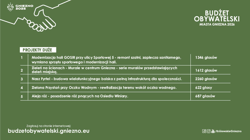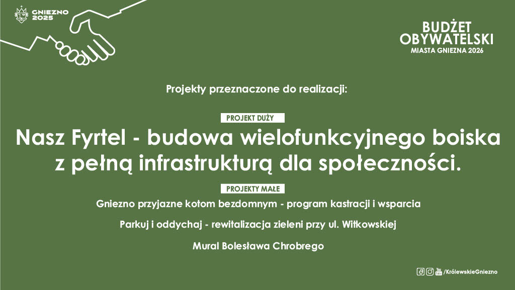 Wśród pięciu zakwalifikowanych projektów tzw. dużych zwyciężył Nasz Fyrtel. To budowa wielofunkcyjnego boiska z pełną infrastrukturą dla społeczności. Lokalizacja: ul. Konopnickiej, teren boiska i sali klubu Stella Gniezno – uzyskał 2260 głosów. Projekt ten zakłada budowę ogólnodostępnego, wielofunkcyjnego boiska sportowego z pełną infrastrukturą towarzyszącą, które służyć będzie całej społeczności lokalnej, ze szczególnym uwzględnieniem potrzeb dzieci, młodzieży, seniorów oraz osób z niepełnosprawnością. Boisko zostanie przystosowane do gry w piłkę nożną, siatkówkę i koszykówkę. W jego otoczeniu powstanie strefa relaksu i kibica, z ławkami, zadaszeniem przeciwsłonecznym, stołami oraz zielenią rekreacyjną. Zastosowane zostaną rozwiązania dostępnościowe – m.in. brak progów, nawierzchnia przyjazna dla wózków, tablica informacyjna z pismem Braille’a i podjazdy. Koszt szacunkowy to 600 tys. złotych.