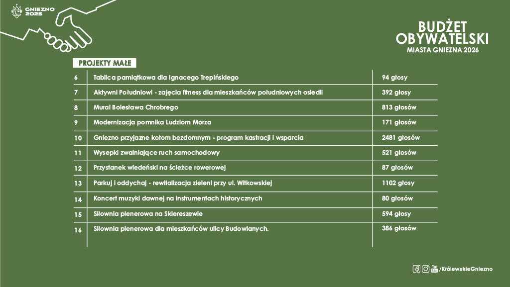 – W kategorii projektów małych, a było ich 11, zwyciężyły 3 projekty. Na realizację w tej kategorii przeznaczono 200 tysięcy złotych i trzy najlepsze zmieściły się w tej kwocie – dodał Wiktor Koliński, zastępca dyrektora Wydziału Promocji, Kultury i Turystyki UM w Gnieźnie. Najwięcej głosów otrzymał projekt „Gniezno przyjazne kotom bezdomnym – program kastracji i wsparcia” – 2481 głosów. Projekt zakłada pomoc bezdomnym kotom, które cierpią z powodu braku odpowiedniej opieki, żyjąc na ulicach i ogrodach działkowych i będąc narażonymi na choroby, głód i wiele niebezpieczeństw. Koszt szacunkowy to 60 tys. zł. Drugi w tej kategorii był – „Parkuj i oddychaj – rewitalizacja zieleni przy ul. Witkowskiej” – 1102 głosy. Projekt zakłada rewitalizację infrastruktury zielonej między blokami 28, 30 i 32 przy ul. Witkowskiej w Gnieźnie z uwzględnieniem miejsc parkingowych dla osób z niepełnosprawnością. Koszt szacunkowy to 60 tys. zł. Trzecią pozycję zajął projekt „Mural Bolesława Chrobrego. Lokalizacja: ul. Farna 2” – 813 głosów. Powstanie muralu na ścianie kamienicy w ścisłym centrum miasta przedstawiającego postać Bolesława Chrobrego. Koszt szacunkowy – 70 tys. zł. Gnieźnianki i gnieźnianie mogli głosować od 5 do 30 września przez internet za pomocą aktywnej karty lub wysyłając skan wypełnionej karty. Możliwe było także głosowanie w tradycyjnej formie – urny znalazły się w różnych częściach Gniezna. Pula pieniędzy podzielona została na projekty duże (na ten cel było 800 tys. zł) i małe (200 tys. zł). Zagłosowało 8255 mieszkańców, a głosów oddanych na poszczególne projekty było aż 13248. Za pośrednictwem internetu zagłosowało 3792 gnieźnian, a poprzez wrzucenie karty do urny 4463 osoby.